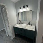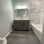 Both bathrooms were fully renovated with modern upgrades. The primary suite now features a walk-in shower with new flooring, glass shower doors, a double vanity, rain shower head with a sprayer, updated lighting and plumbing, and a new toilet. The second bathroom was updated with a new tub, subway-tiled shower surround, rain shower head with a sprayer, a new vanity, updated lighting, modern plumbing fixtures, and a new toilet.