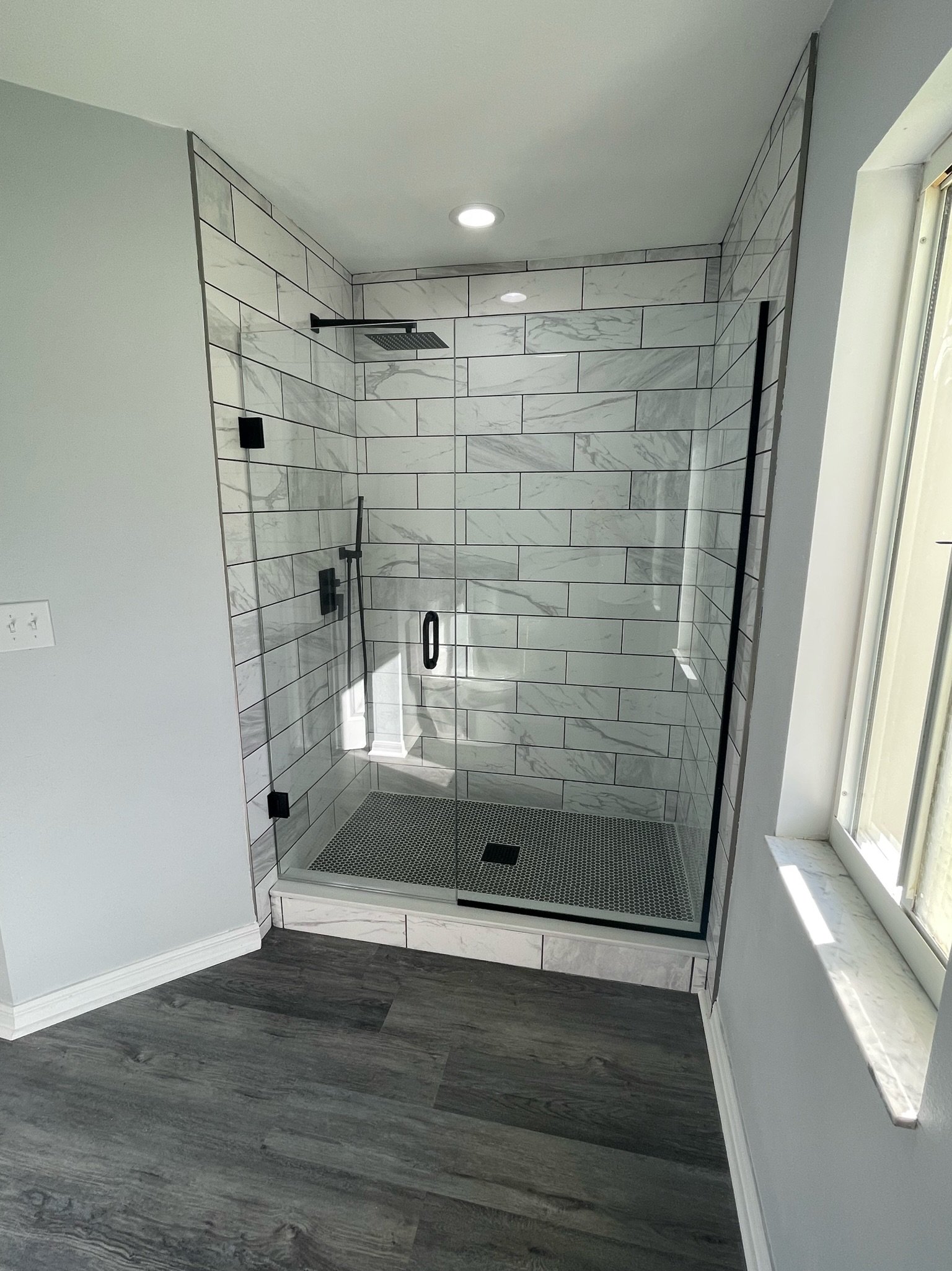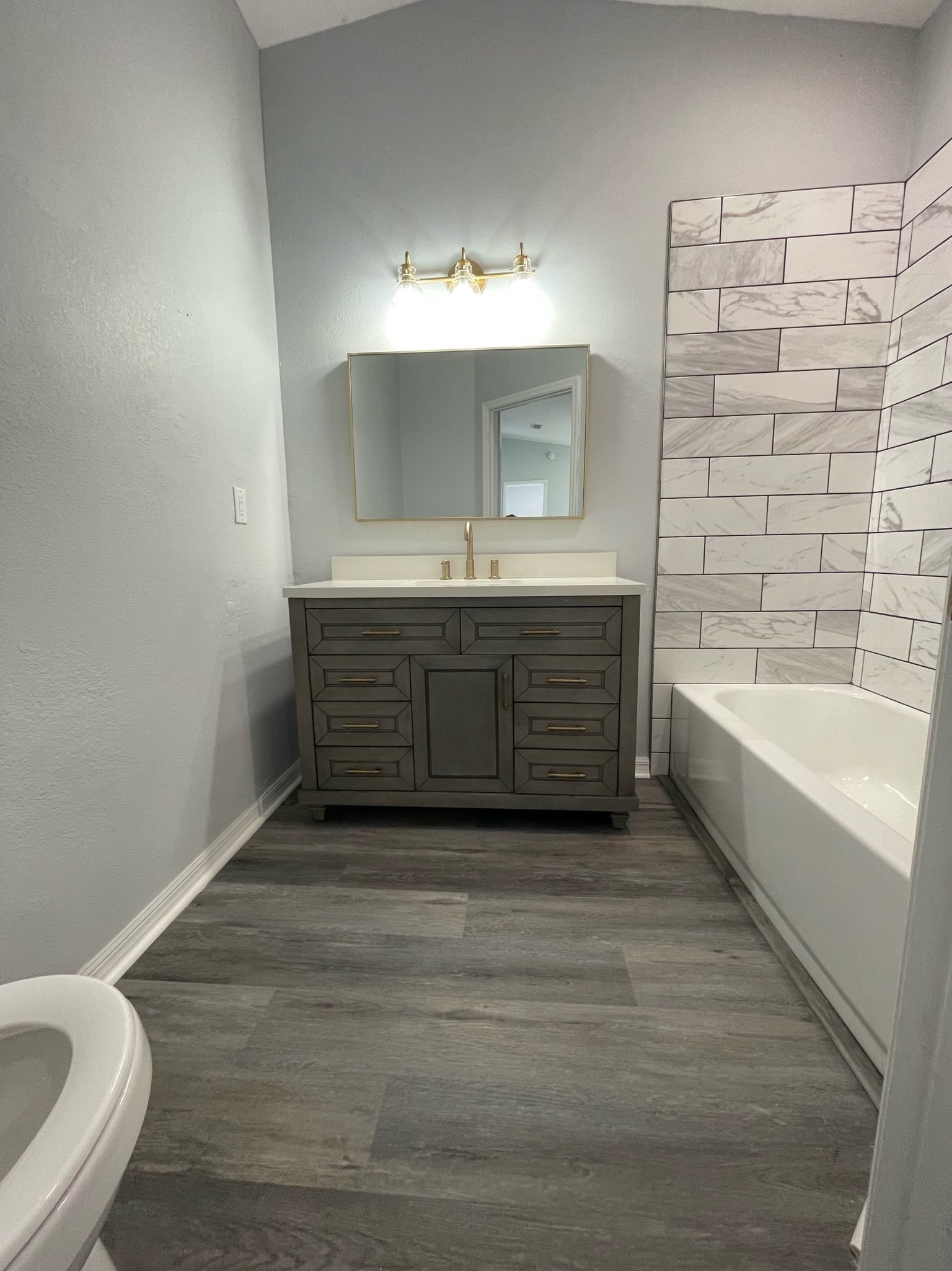 Both bathrooms were fully renovated with modern upgrades. The primary suite now features a walk-in shower with new flooring, glass shower doors, a double vanity, rain shower head with a sprayer, updated lighting and plumbing, and a new toilet. The second bathroom was updated with a new tub, subway-tiled shower surround, rain shower head with a sprayer, a new vanity, updated lighting, modern plumbing fixtures, and a new toilet.