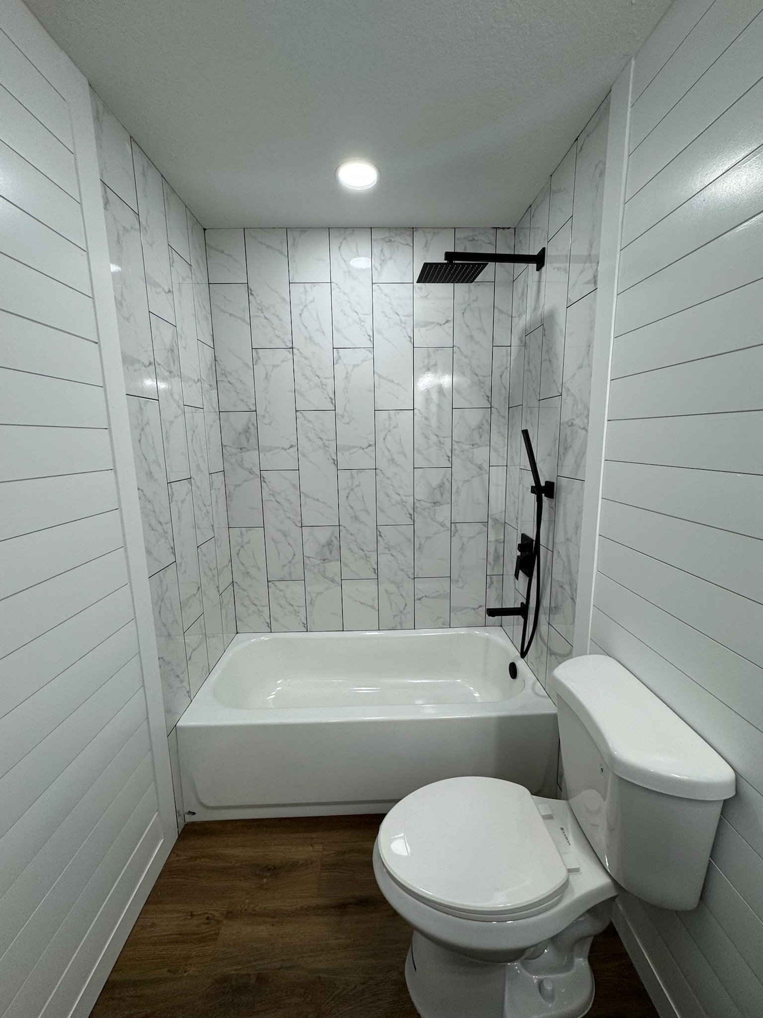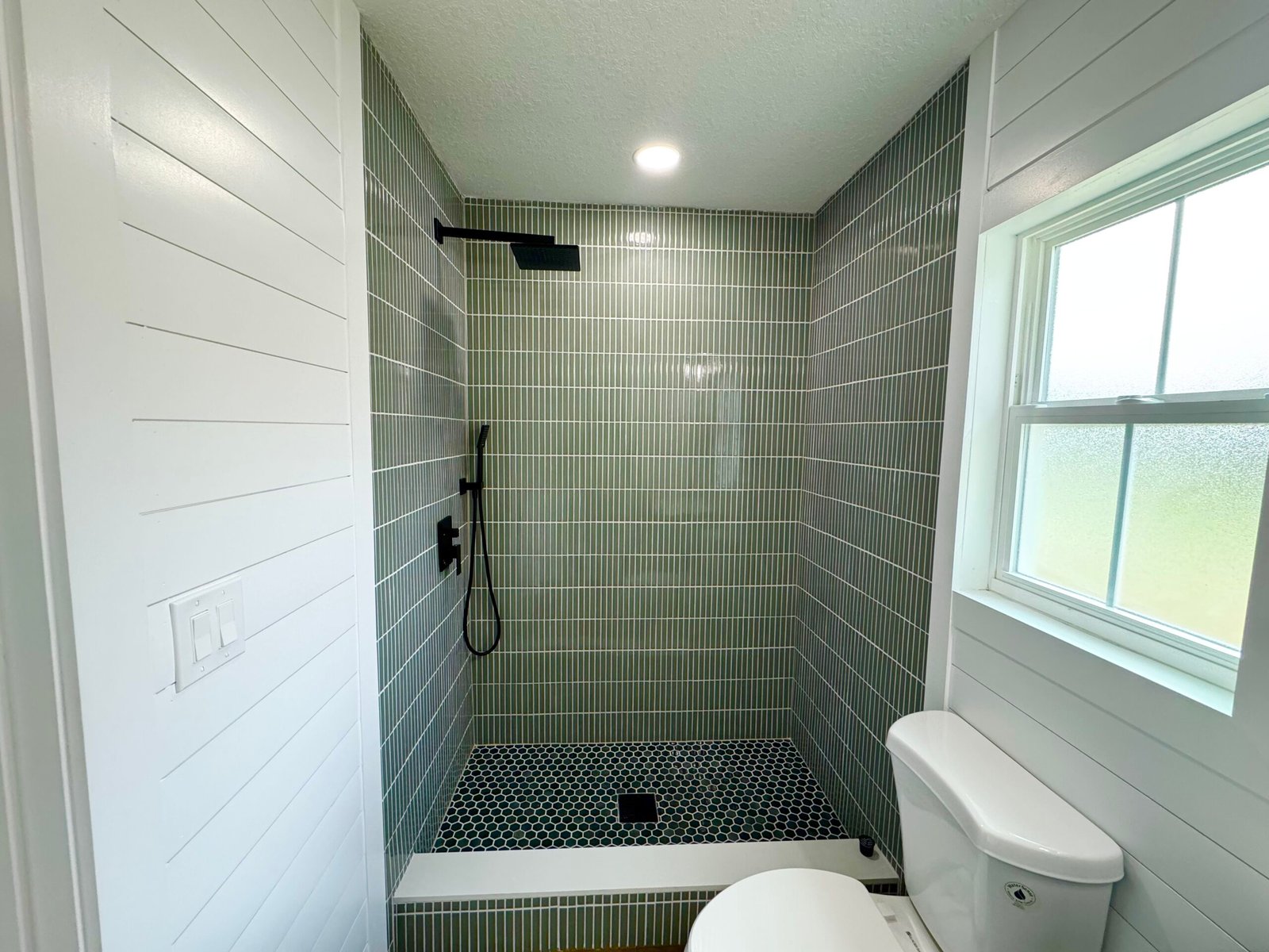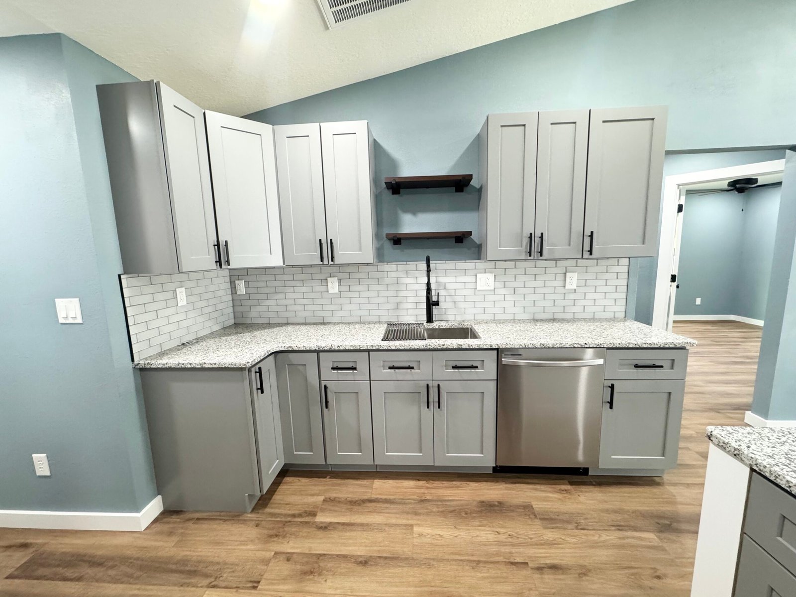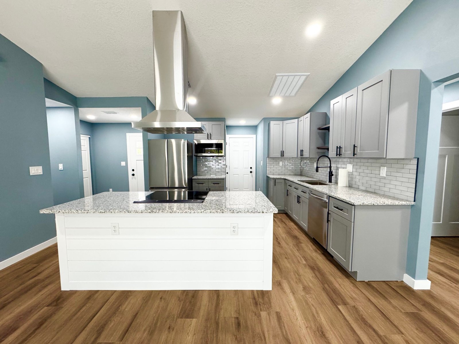 The home was outfitted with recessed lighting throughout, durable and stylish luxury vinyl plank flooring, and a sleek modern board-and-batten exterior. The heart of the home — the kitchen — featured granite countertops, stainless steel appliances, a glass tile backsplash, and a large island equipped with a built-in range and range hood. Additional touches included a farmhouse sink, microwave, dishwasher, and ample counter space, creating a kitchen that was both functional and beautiful.