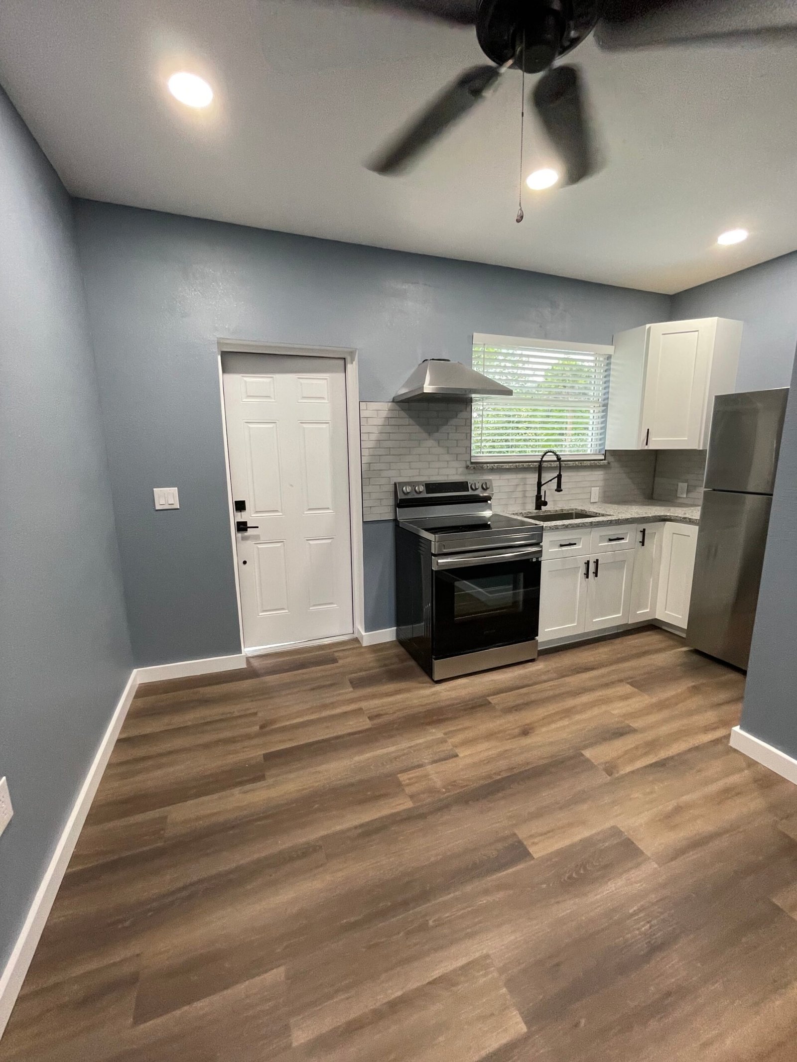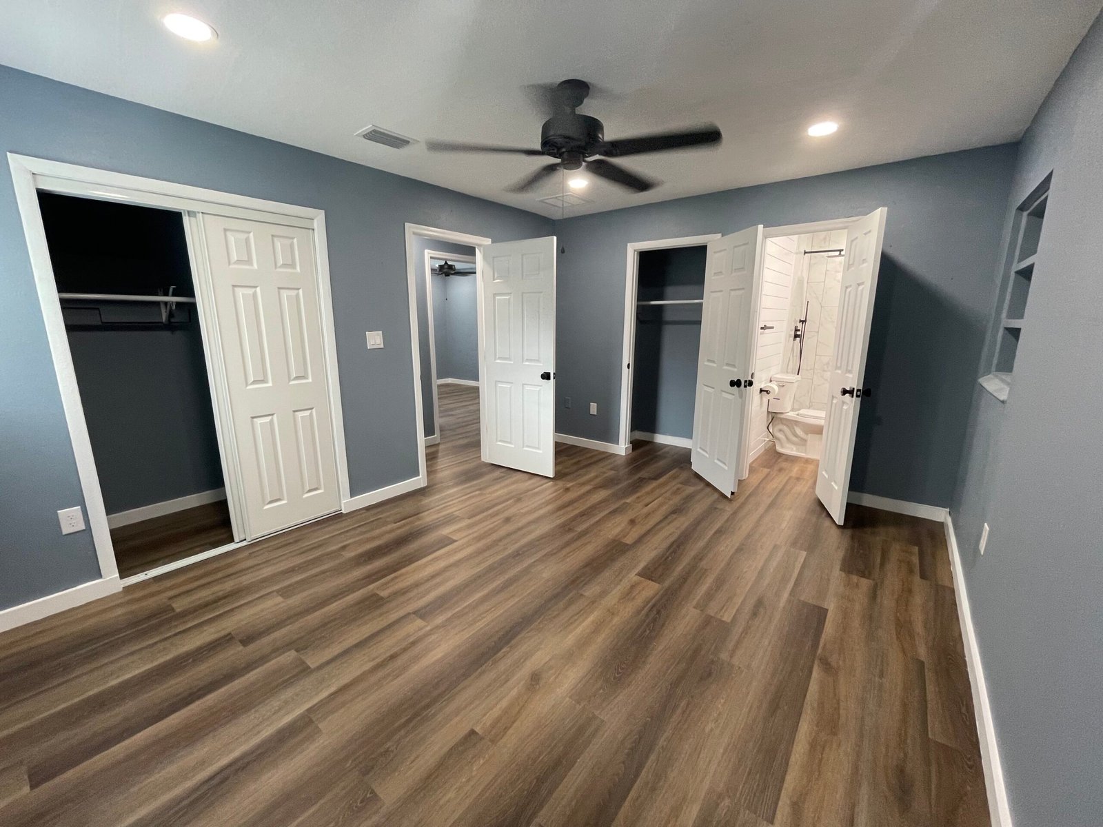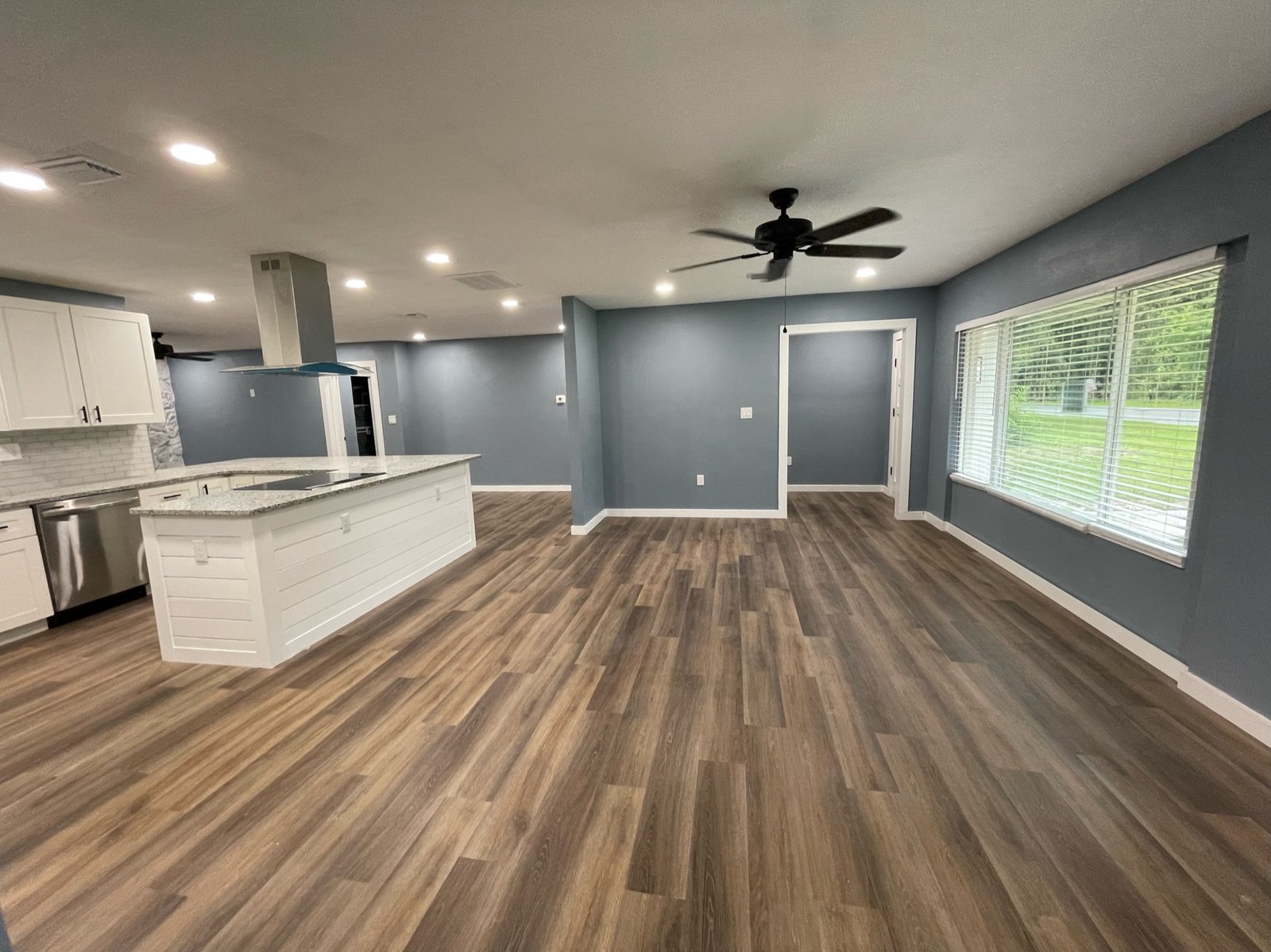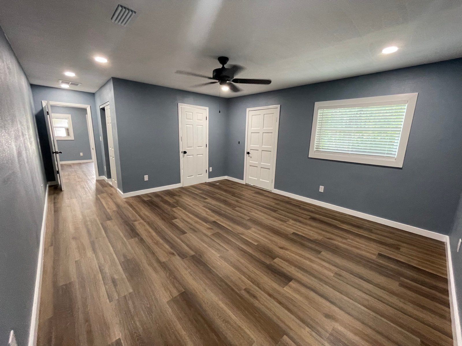 With the structure sound, we turned our attention to the finishes. The main home now features four bedrooms and three bathrooms, including two master suites, while the separate efficiency apartment offers a one-bedroom, one-bath layout. Both spaces received fresh interior and exterior paint, recessed lighting in every room, ceiling fans in all living areas and bedrooms, modern Decora-style switches and outlets, and durable LVP flooring.