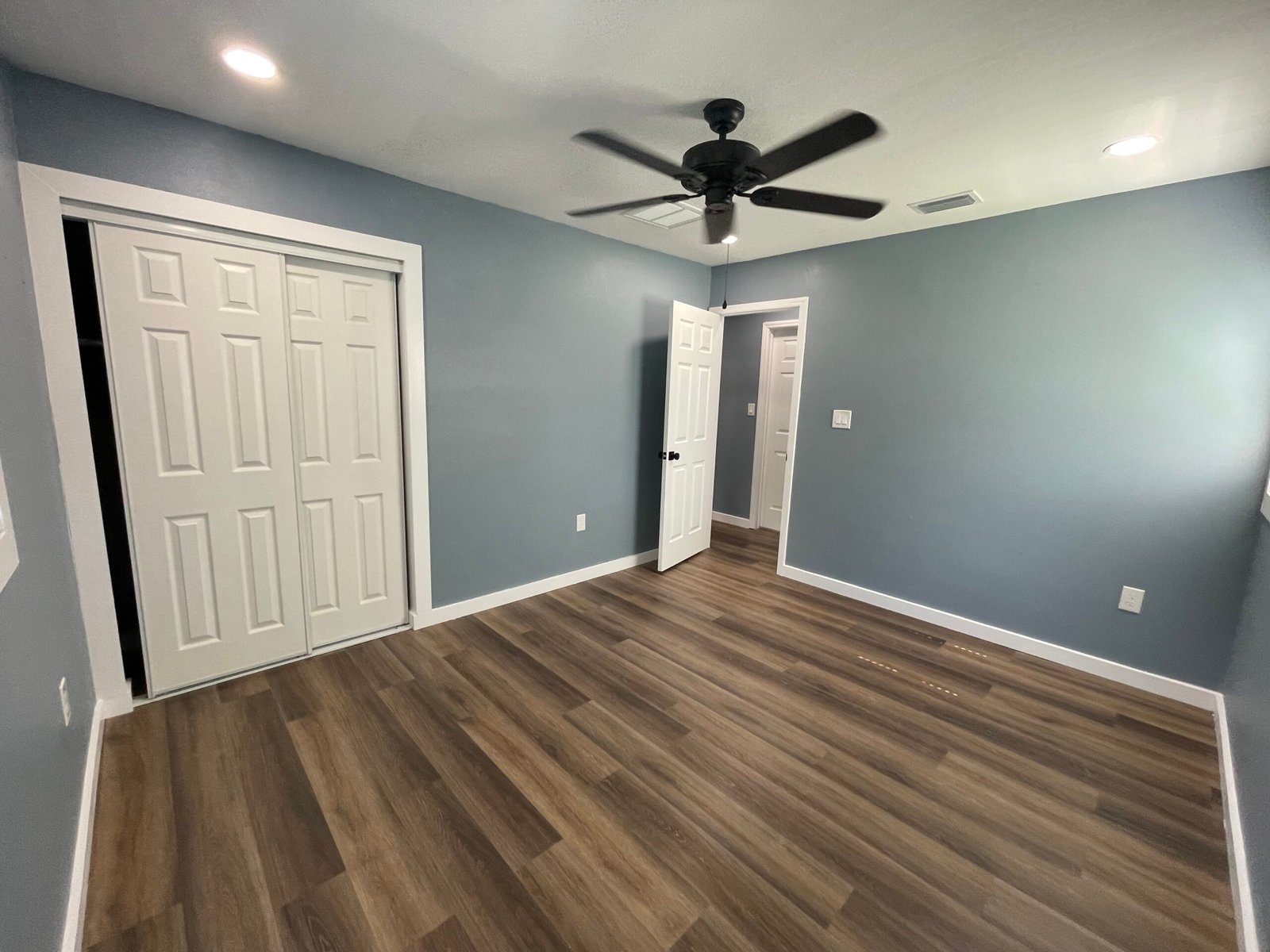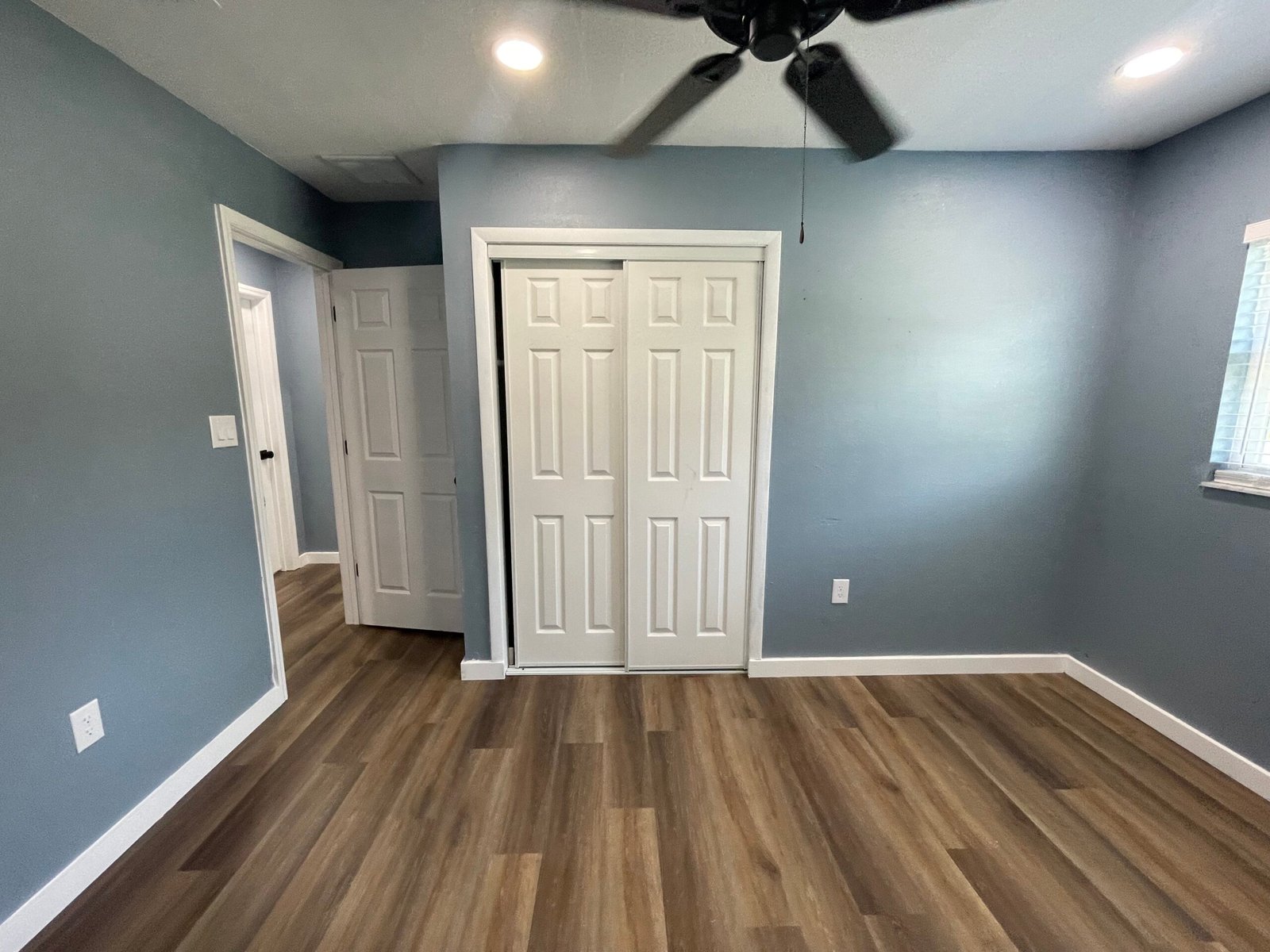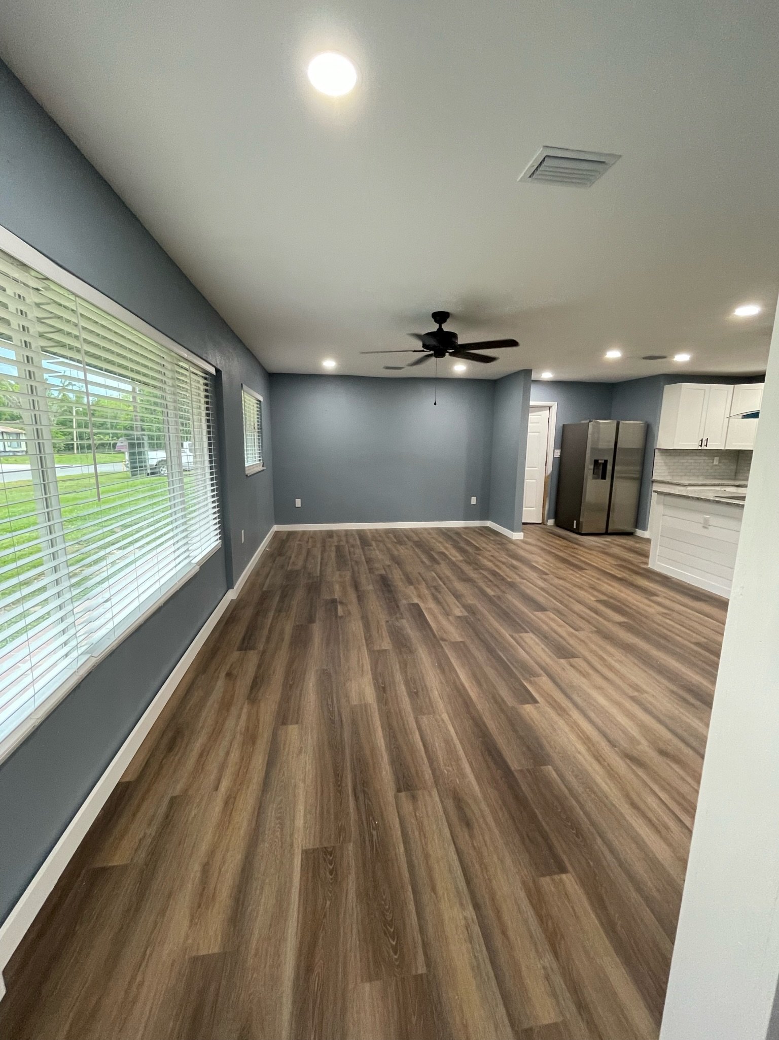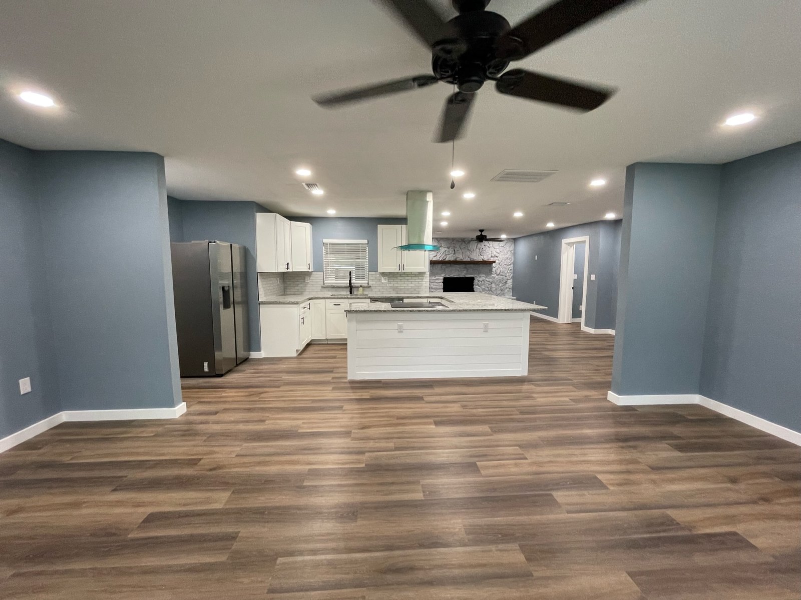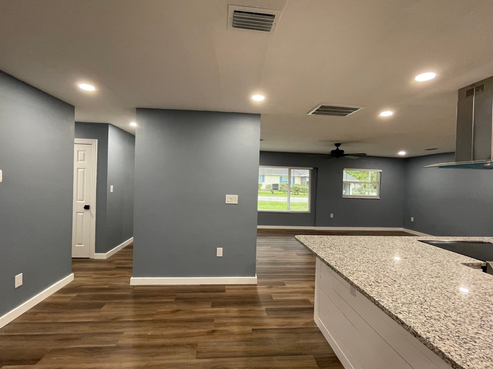 With the structure sound, we turned our attention to the finishes. The main home now features four bedrooms and three bathrooms, including two master suites, while the separate efficiency apartment offers a one-bedroom, one-bath layout. Both spaces received fresh interior and exterior paint, recessed lighting in every room, ceiling fans in all living areas and bedrooms, modern Decora-style switches and outlets, and durable LVP flooring.