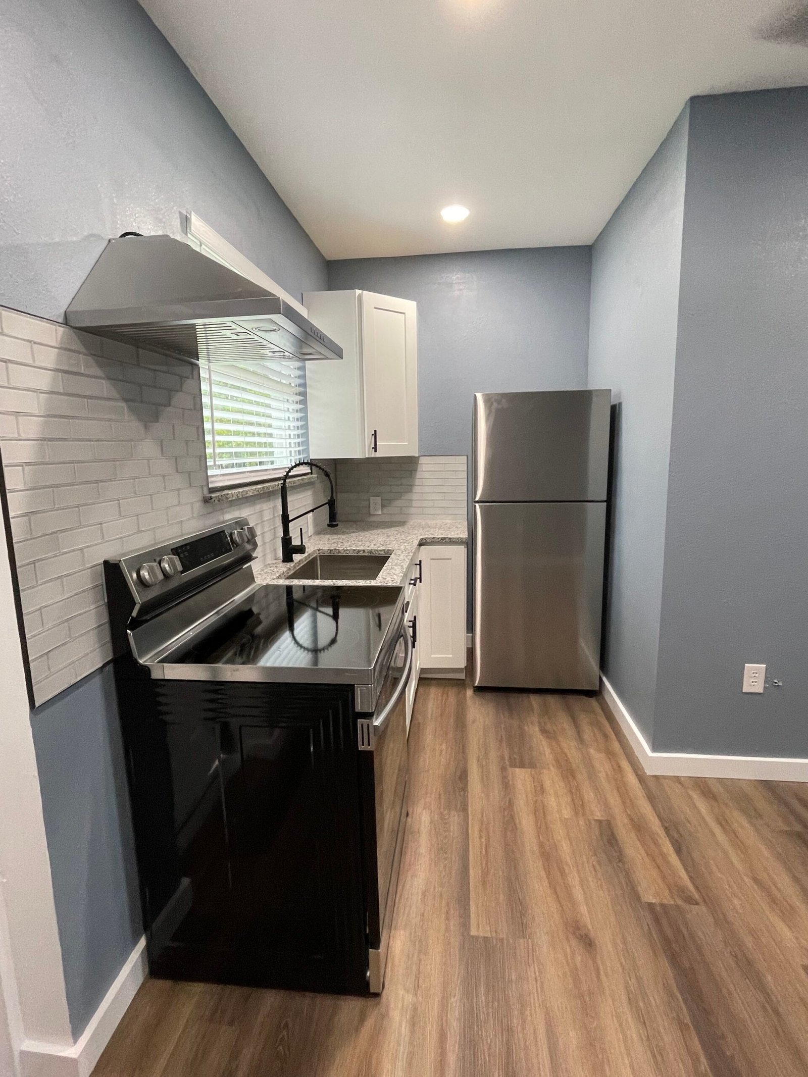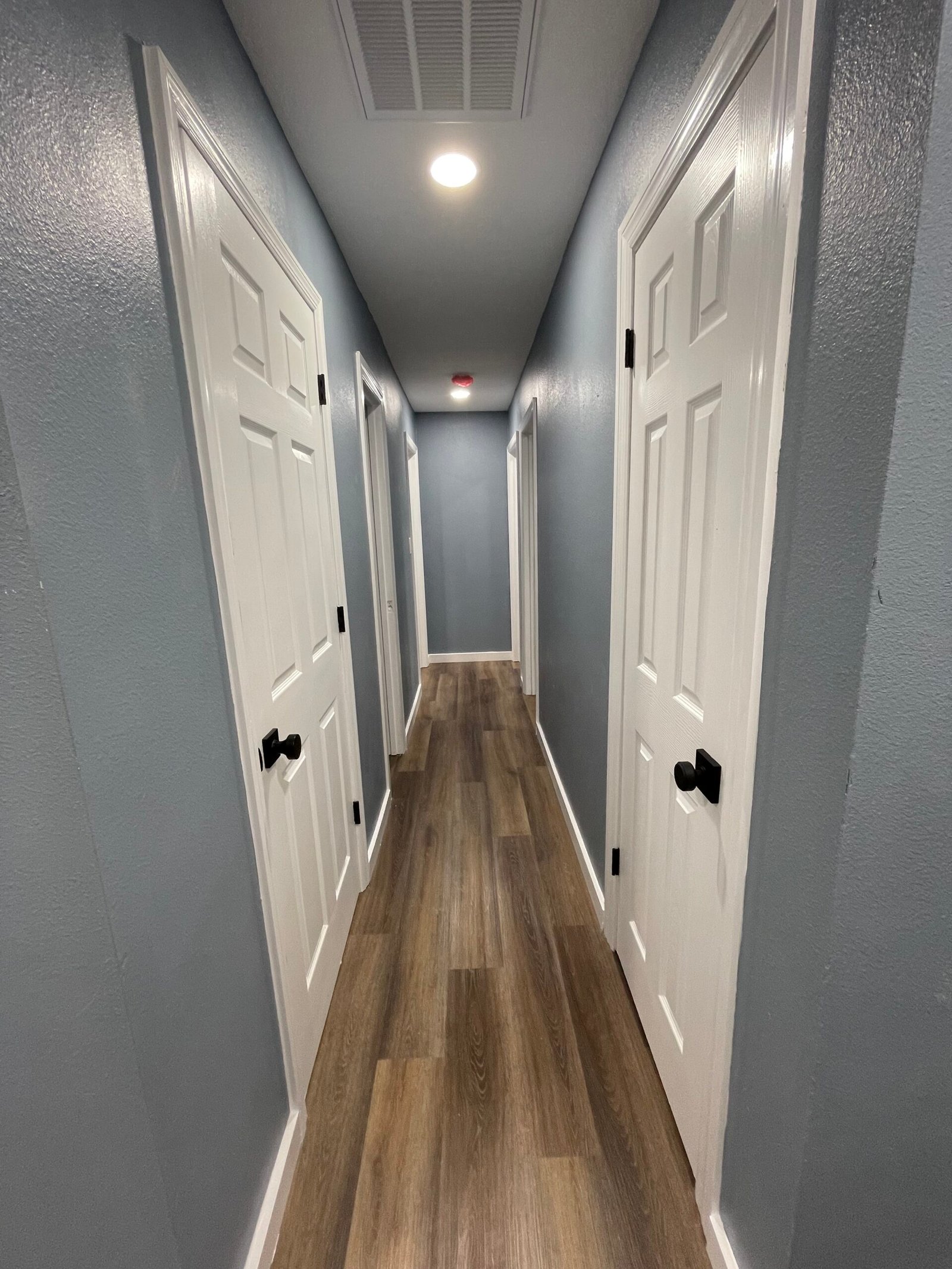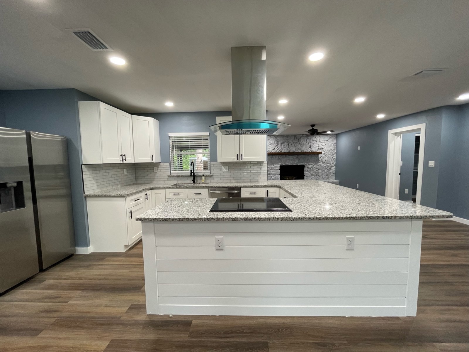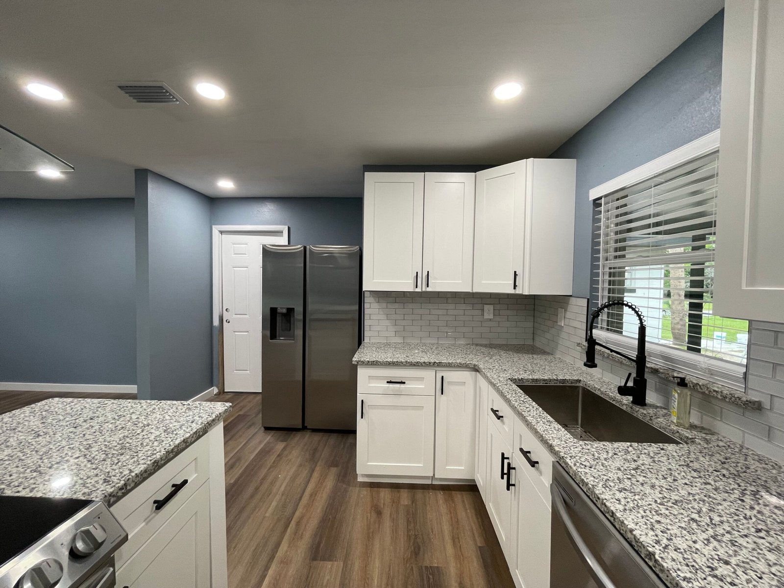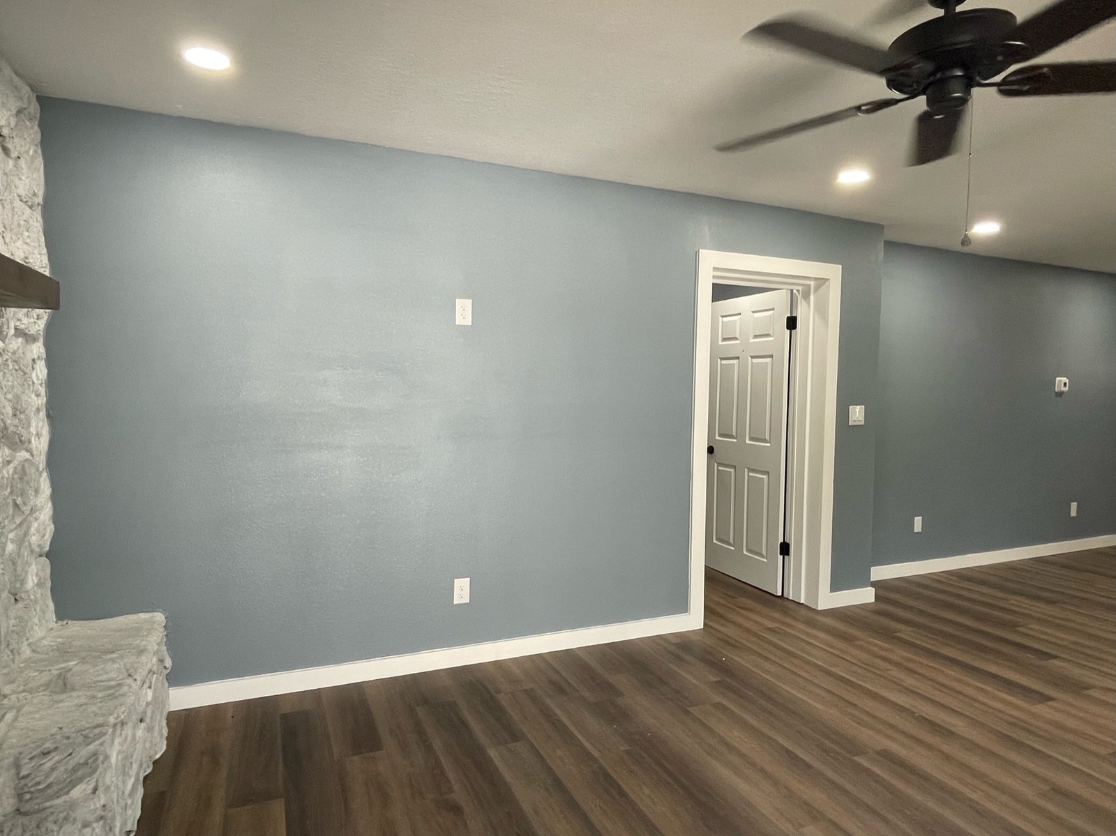With the structure sound, we turned our attention to the finishes. The main home now features four bedrooms and three bathrooms, including two master suites, while the separate efficiency apartment offers a one-bedroom, one-bath layout. Both spaces received fresh interior and exterior paint, recessed lighting in every room, ceiling fans in all living areas and bedrooms, modern Decora-style switches and outlets, and durable LVP flooring.