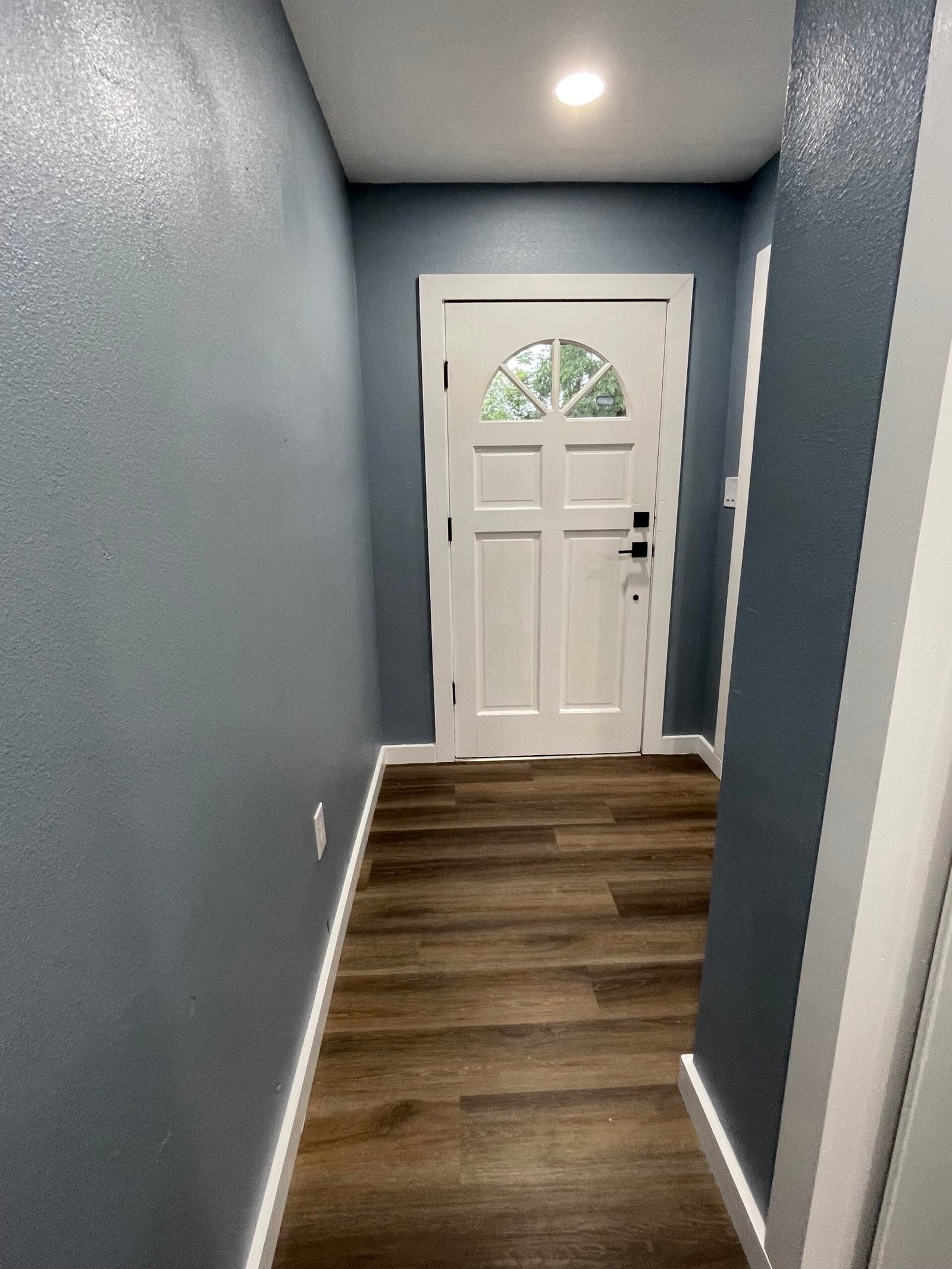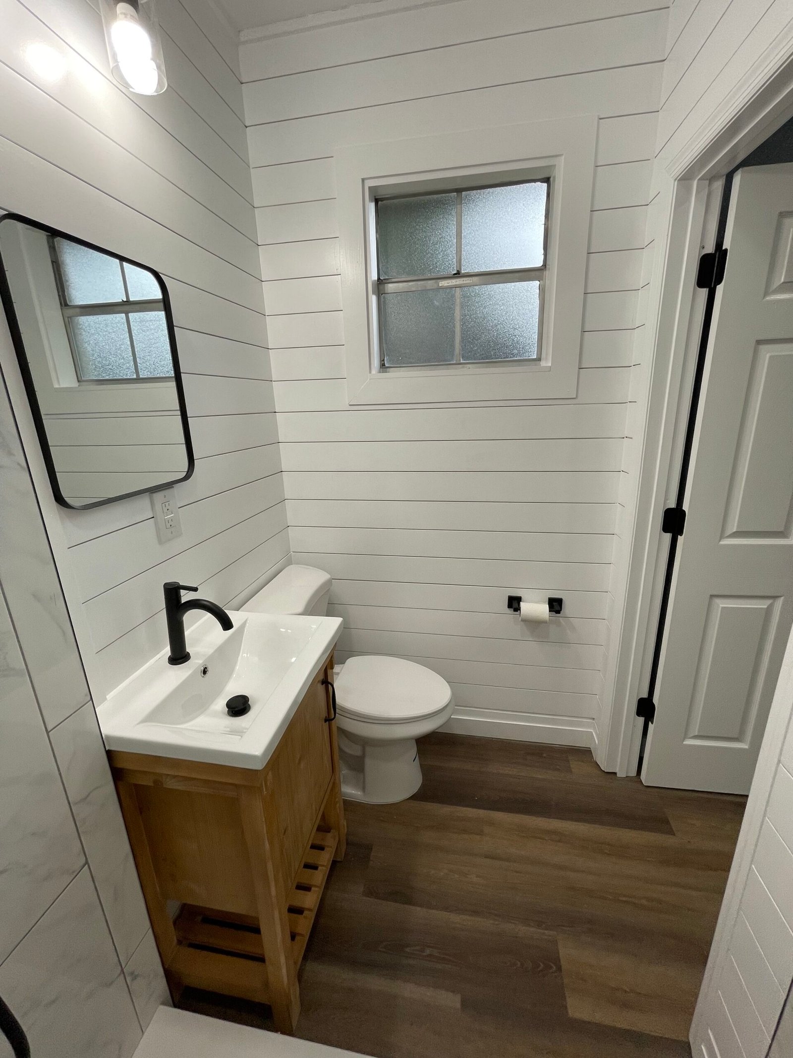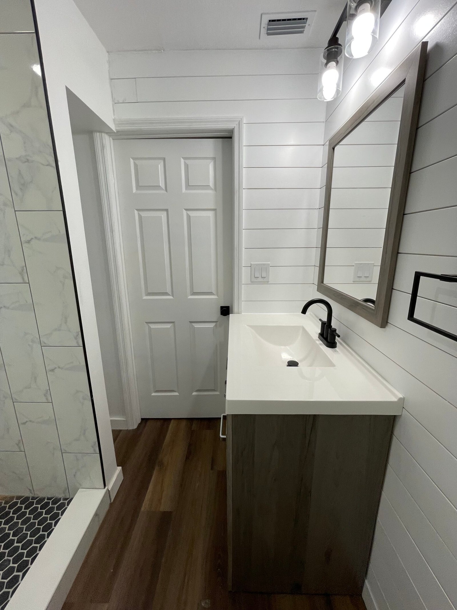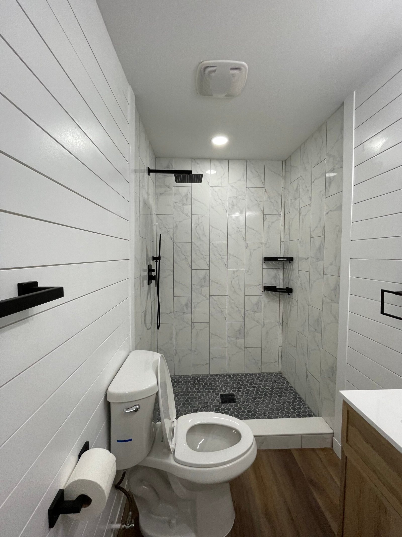 With the structure sound, we turned our attention to the finishes. The main home now features four bedrooms and three bathrooms, including two master suites, while the separate efficiency apartment offers a one-bedroom, one-bath layout. Both spaces received fresh interior and exterior paint, recessed lighting in every room, ceiling fans in all living areas and bedrooms, modern Decora-style switches and outlets, and durable LVP flooring.