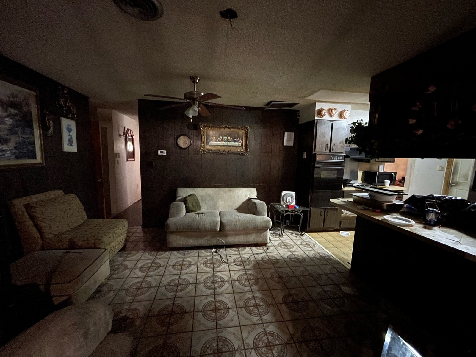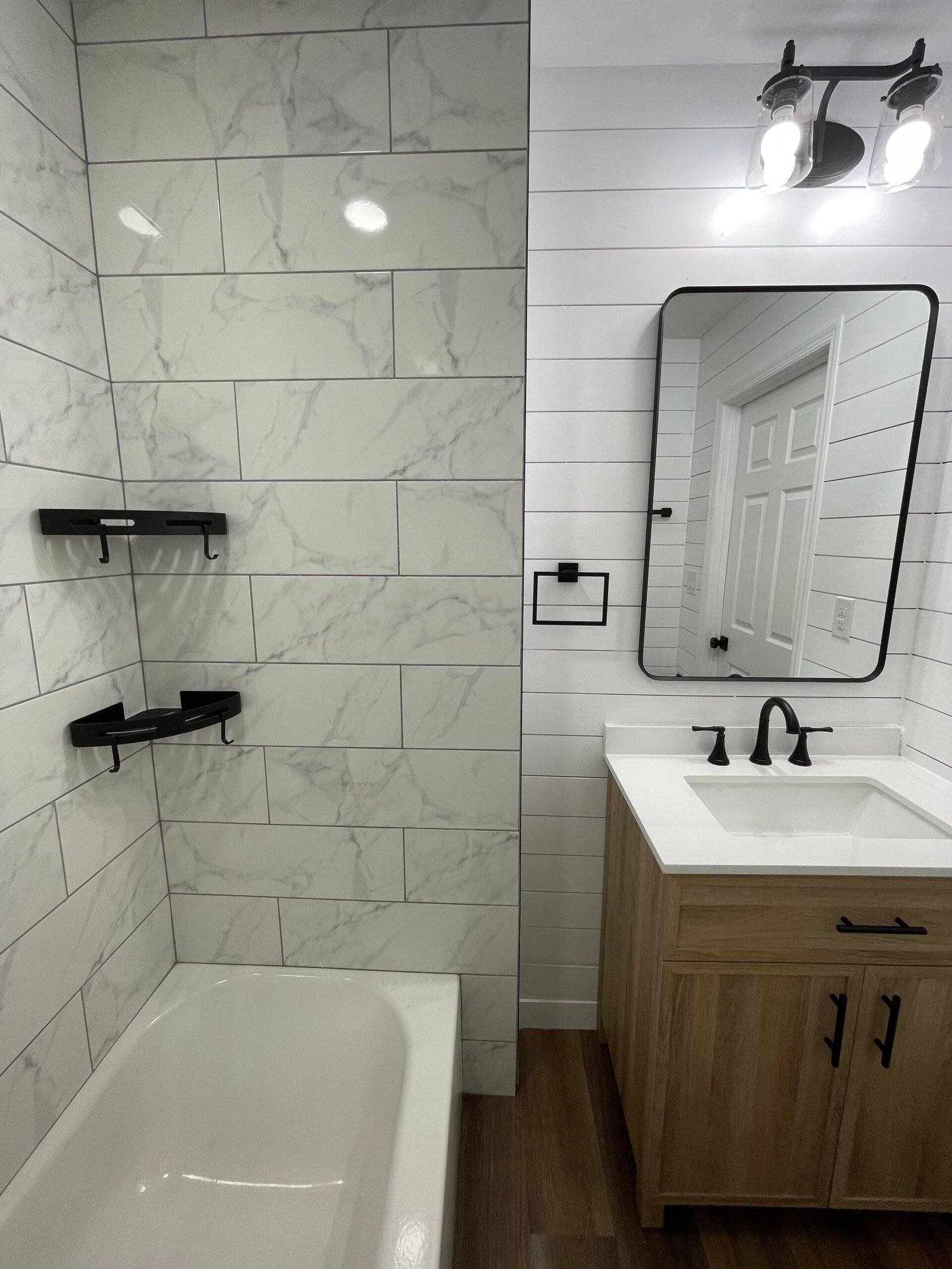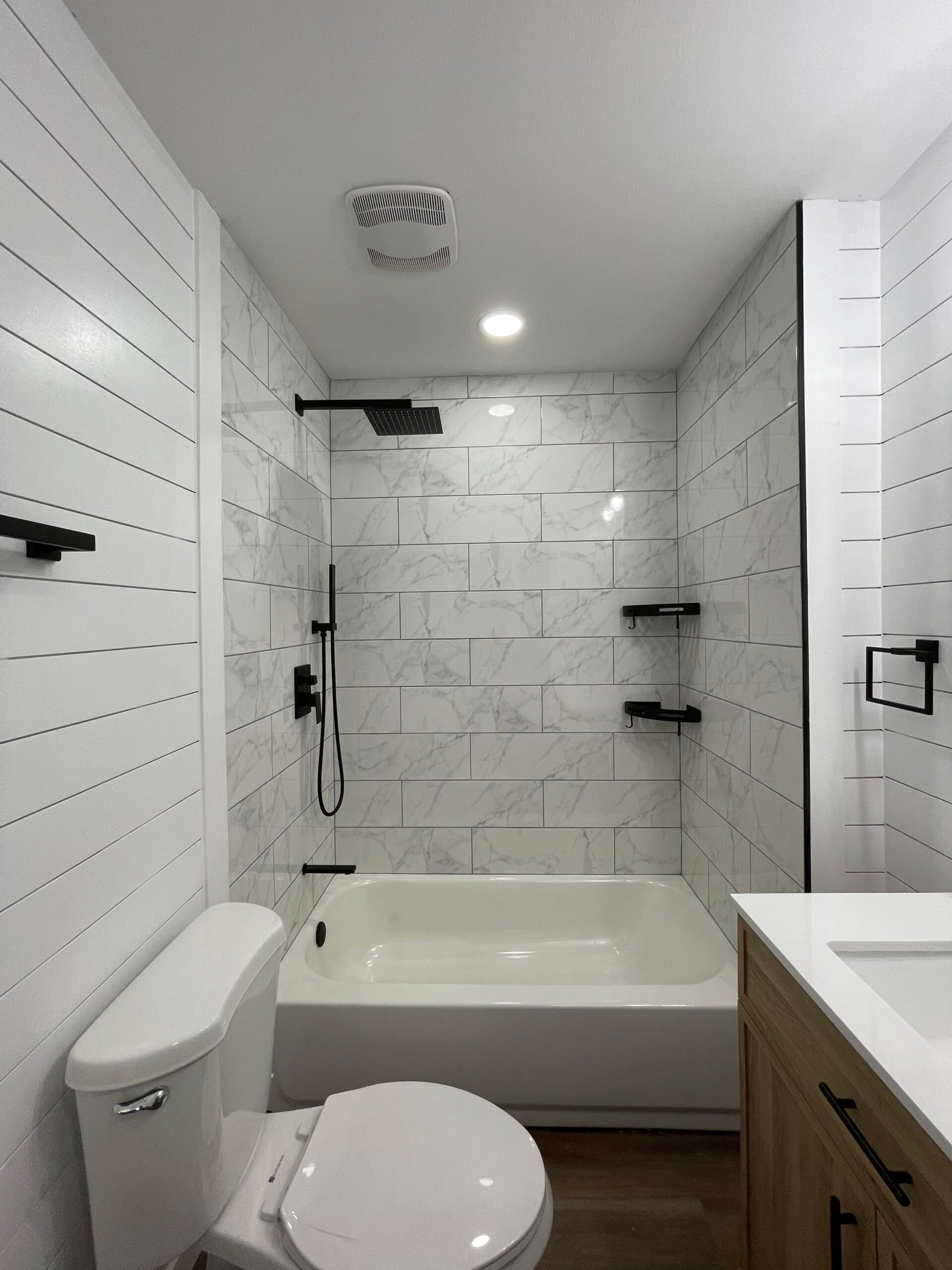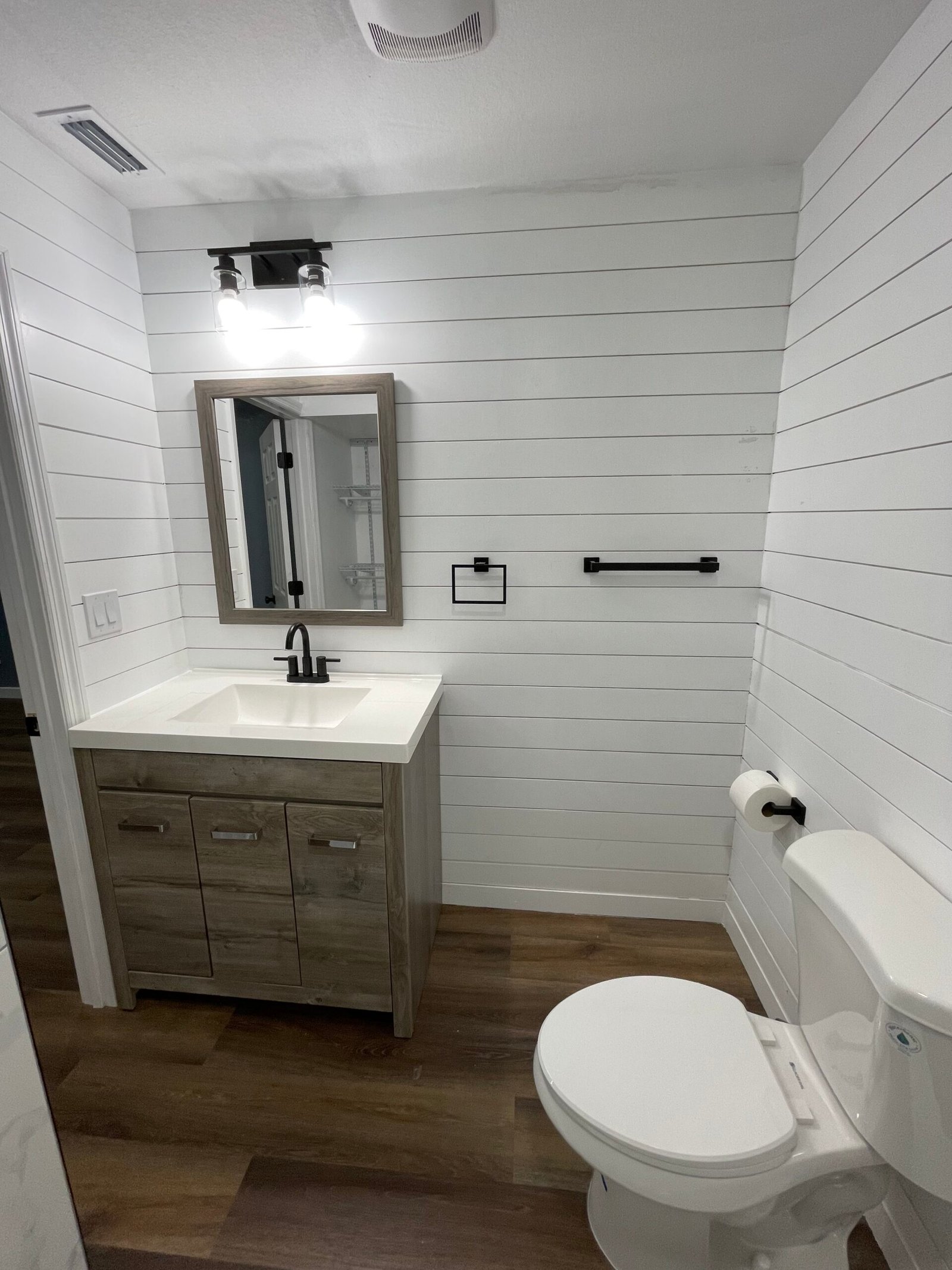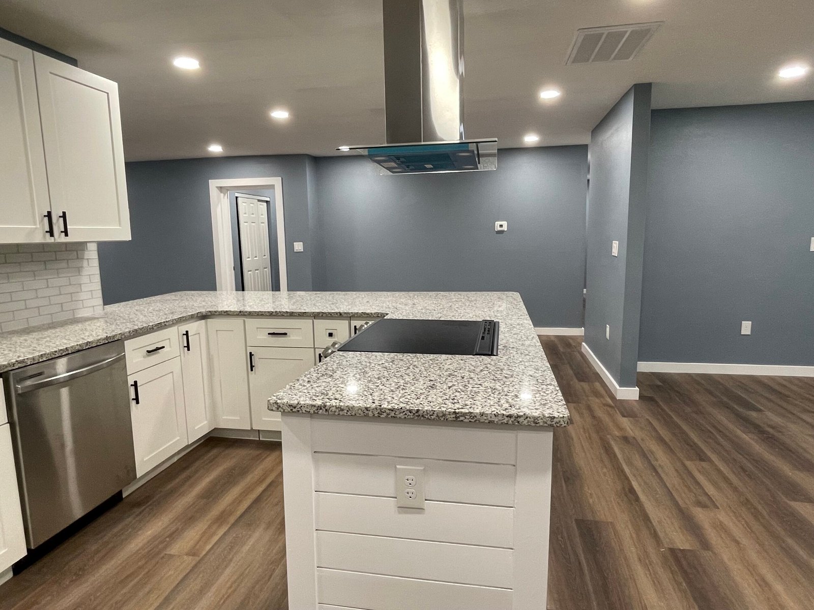 With the structure sound, we turned our attention to the finishes. The main home now features four bedrooms and three bathrooms, including two master suites, while the separate efficiency apartment offers a one-bedroom, one-bath layout. Both spaces received fresh interior and exterior paint, recessed lighting in every room, ceiling fans in all living areas and bedrooms, modern Decora-style switches and outlets, and durable LVP flooring.